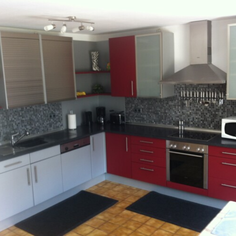 Es ist eine komplett eingerichtete Selbstversorgerküche inkl. Kühlschrank Backofen, Kochfeld, Mikrowelle, Wasserkocher, Kaffeemaschine und kompletten Inventar vorhanden.
