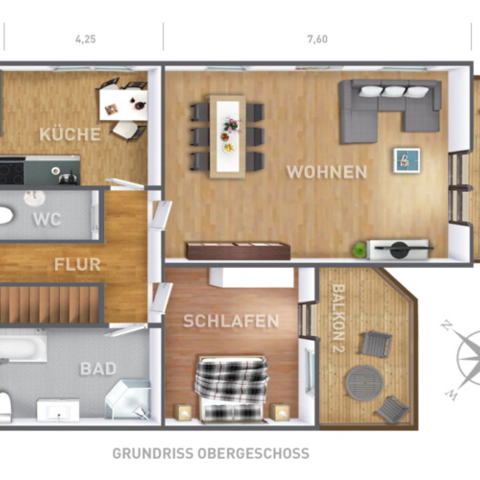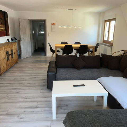 4-9 Personen auf 2 Etagen mit 115qm, bestehend aus 3.5 Doppel SZ, 1 WZ (45qm) mit XXL (Schlaf-)Couch, komplett eingerichteter Einbauküche mit Spülmaschine, 1 Bad mit Wanne, WC und Duschkabine, 1 extra Gaeste WC, Sonnen-Dachterrasse, ueberdachter Balkon, mehrere kostenlose Stellplätze, auch für einen LKW, Garten, Grillplatz und kostenloses WiFi.
