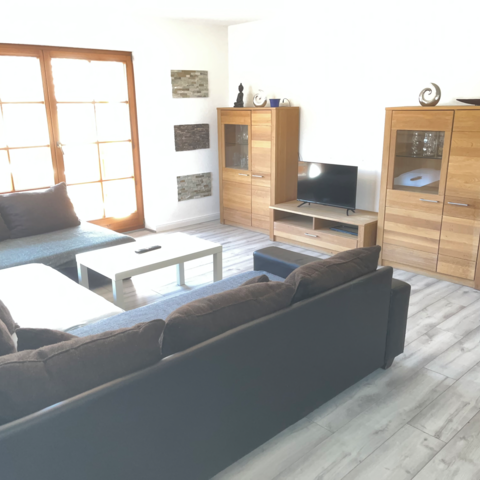 4-9 Personen auf 1 Etage mit 115qm Wfl., bestehend aus 2 Doppel SZ, 1 & Bettzimmer, 1 WZ (45qm) mit XXL (Schlaf-)Couch und extra EInzelbett, komplett eingerichteter Einbauküche mit Spülmaschine, 1 Bad mit Wanne, WC und Duschkabine, 1 extra Gaeste WC, 40qm Sonnen-Terrasse mit -möbeln, mehrere kostenlose Stellplätze, auch für einen LKW, Garten, Grillplatz und kostenloses WiFi. 55” TV.