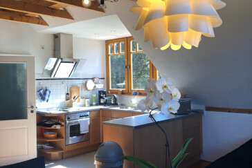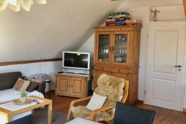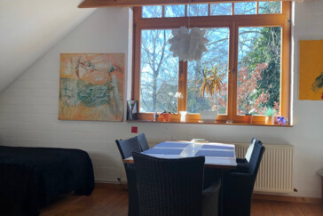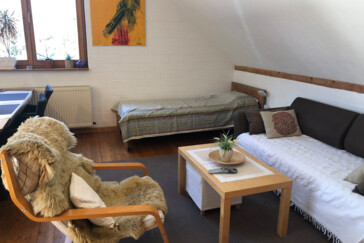 Gemütliche, helle und freundliche Ferienwohnung im separaten Haus, ca. 75 qm groß, komfortabel eingerichtet mit TV und kostenlosem WLAN. Die Küche ist gut ausgestattet und im Wohnbereich integriert. Es gibt max. 4 Schlafmöglichkeiten, davon zwei im separaten Schlafzimmer, ein 140 cm breites Bett und ein zusätzliches Bett im Wohnbereich. Sowie ein Hochbett, romantisch im Dachgiebel gelegen.