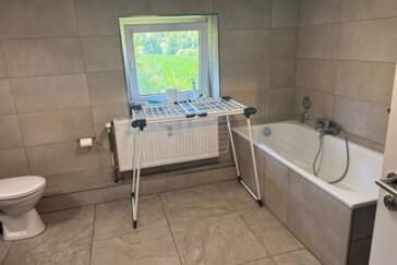 1. Gemeinschaftsbadezimmer mit Badewanne, Dusche, Toilette, Waschbecken und Waschmaschine ausgestattet.