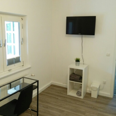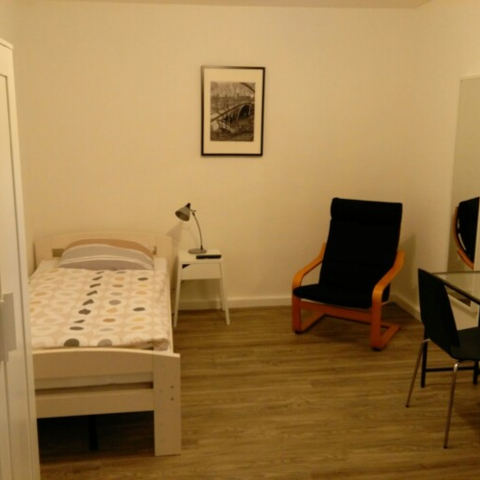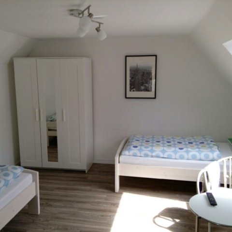 Die Zimmer sind ausgestattet mit Bett (1mx2m), Schrank, Schreibtisch, Sitzgelegenheit sowie Sat-TV mit DVD-Player und Radio. W-LAN steht im gesamten Haus zur Verfügung. Für Koffer oder größere Gegenstände gibt es einen Abstellraum im OG.