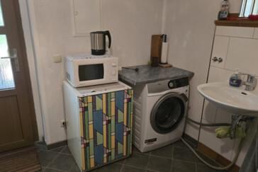Kleine, separat zugängliche Wohnung (28 m²): gemütliches Wohn-/Schlafzimmer (Schlafcouch ausklappbar) + Funktionsraum mit WC, Waschbecken und Dusche. WLAN, Kabel-TV. Doppelkochplatte, Mikrowelle, Wasserkocher sowie Kühlschrank vorhanden. Parkmöglichkeiten direkt vor dem Grundstück. Terrassennutzung.