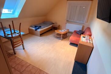 Einkaufsmöglichkeiten (Lidl, Bäcker, Kiosk, Apotheke) sowie Bushaltestelle in ca. 500 m Entfernung. Ruhige Lage, gute Anbindung, ideal für Monteure und Berufspendler.