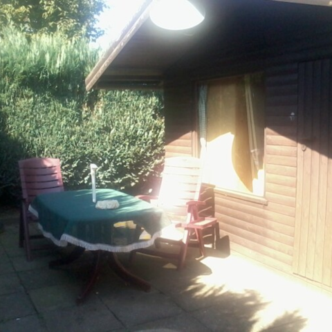 - Terrasse mit Blockhütte und Grillplatz auf dem Grundstück