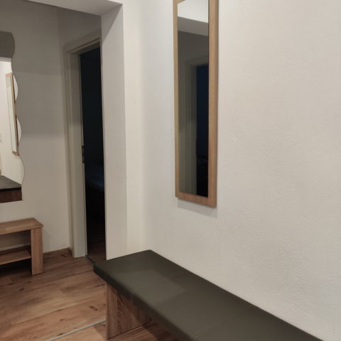 Badezimmer mit Dusche, WC und Waschbecken, Handtücher, Badetücher, Seife, Fön, Flur mit Garderobe, Schlafzimmer mit Full-HD TV, Bettwäsche.