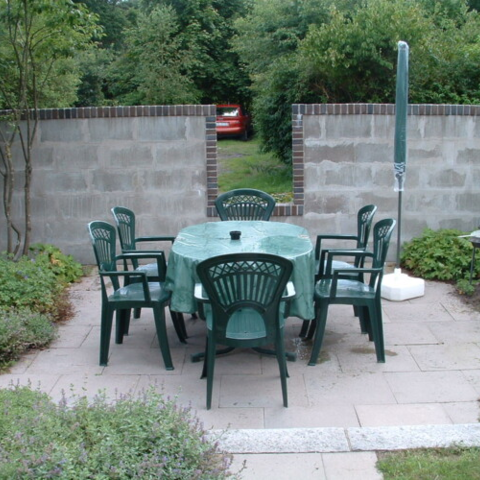 Möblierte Terrasse, kleiner Garten.