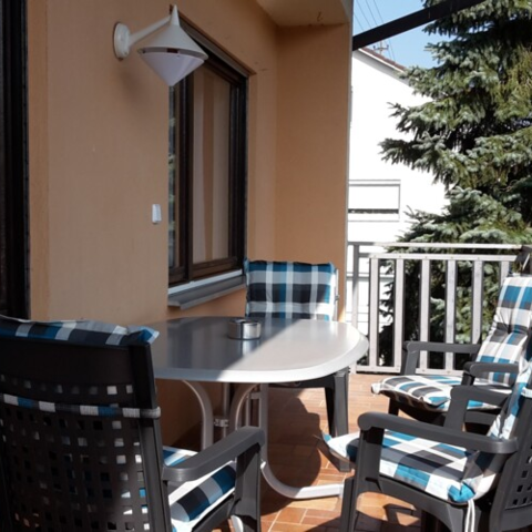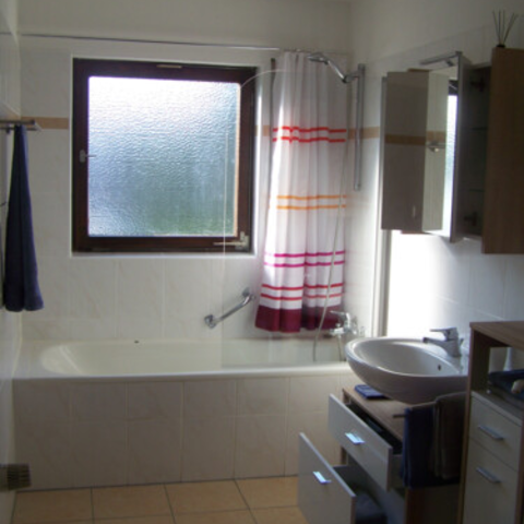 Helle 100qm-Nichtraucher-Wohnung im 1.OG, 1 DZ (2 Einzelbetten!), 2 EZ, Bad (Badewanne), sep. Toilette, voll ausgestatt. Küche (Backofen, Herd, Mikrowelle, Spülmasch. etc), grosser Wohn-Essbereich, SAT-TV und WLAN, Balkon (m. Grill).