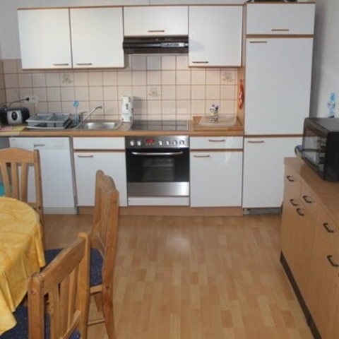 Die Einbauküche ist mit Geschirrspüler, Abzugshaube, Ceran-Herd, Backofen, Mikrowelle, Wasserkocher, Toaster, Kaffeemaschine, 2 Kühlschränken mit Gefrierfach sowie Esstisch mit Stühlen ausgestattet.