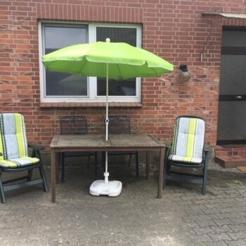 Vor der Wohnung befindet sich eine kleine Sitzecke mit Tisch und Gartenstühlen, dort kann man auch rauchen!