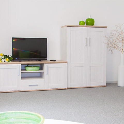 Die Wohnung für Monteure bietet Platz für 1 – 2 Personen, 75qm, Wohnzimmer, Schlafzimmer, Wohnküche, Dusche/WC