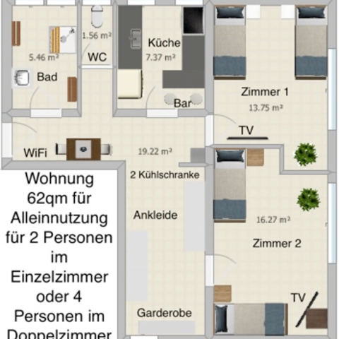 Nebenkosten: 50€ pro Person für 1Monat (Strom,Wasser,Parkplatz,Internet,Bettwäsche und 2 Handtücher)