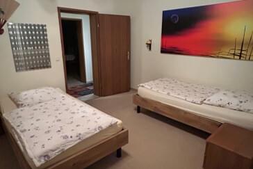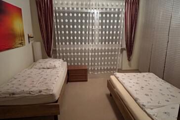 Eine Wohnung befindet sich im Dachgeschoss und ist ca. 90m² groß. Wir haben ein großes Schlafzimmer mit 2 Einzelbetten mit einem großen Flachbildschirm und einen kompletten Sky-Paket (incl. Netflix), ein kleines Schlafzimmer mit einem Einzelbett und ein Wohnzimmer mit einem Einzelbett und einer Couch. Das Wohnzimmer ist sehr groß und komplett möbliert incl. eines Flachbildschirmes mit Kabelanschluss (Sky-Paket incl. Netflix). Die Küche bietet ausreichend Platz für 5 Personen und enthält die wichtigsten Küchengeräte. Das Badezimmer hat ein Waschbecken und eine Dusche.