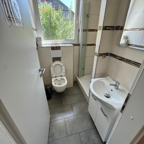 4 Badezimmer: Duschkabine, WC und Waschgelegenheit.