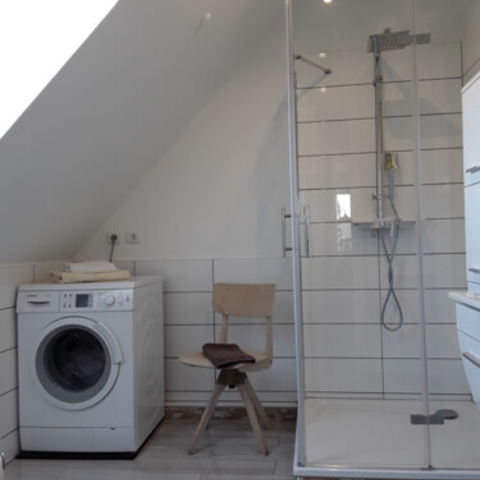 Im Bad ist eine Dusche und eine Waschmaschiene.