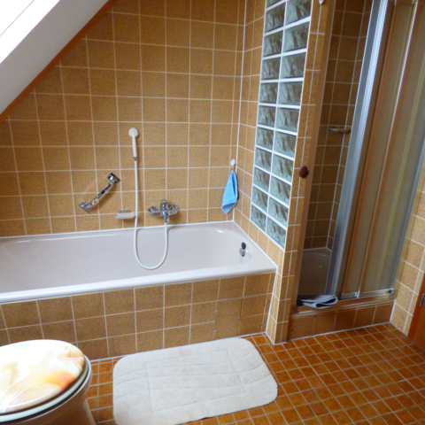 Das Bad hat u.a. eine Badewanne und eine Dusche.