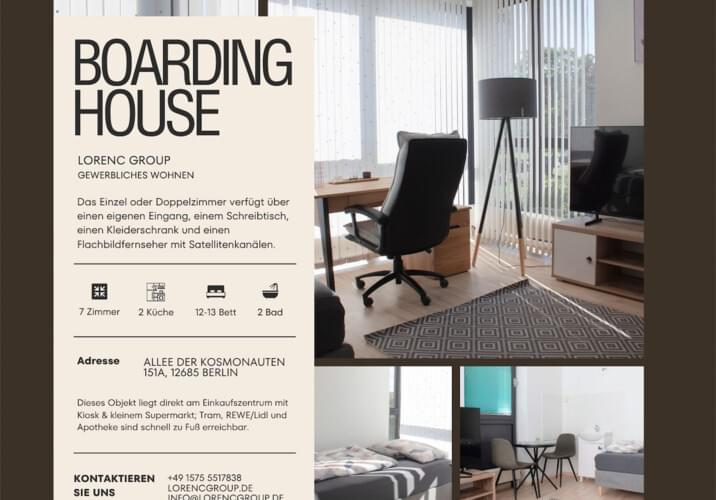 Boarding House für bis zu 13 Personen. Insgesamt 7 Zimmer, Einzel- oder Doppelzimmer, jedes Zimmer mit eigenem Eingang, Kleiderschrank, Schreibtisch und großem Fernseher mit Satellitenempfang. Zwei Gemeinschaftsküchen und zwei Badezimmer und Waschmachine. Parken Frei. Nur Langzeitvermietung an Monteure und Firmen ab 22 Euro pro Person und Nacht. Gerne erstellen Wir Ihnen ein persönliches Angebot. Zentrale Lage in 12685 Berlin. Sie erreichen in kurzer Zeit das Berliner Zentrum. Dieses Objekt liegt direkt am Einkaufszentrum mit Kiosk & kleinem Supermarkt; Tram, REWE/Lidl und Apotheke sind schnell zu Fuß erreichbar.