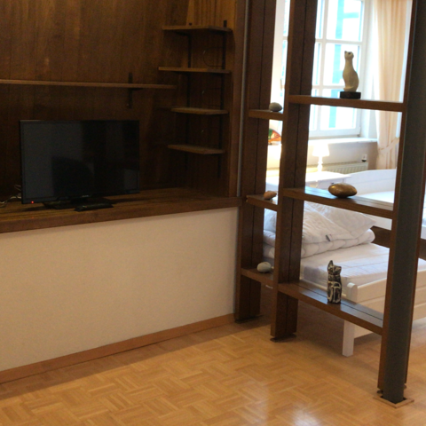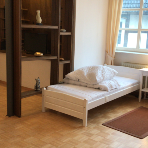 Wohn - Schlafraum mit Küche und abgetrennter Ankleide sowie einem großen Badezimmer mit Dusche ab 15 EUR netto p.P. pro Übernachtung.