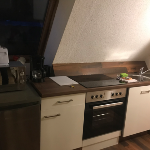 1 x separate Monteurwohnung mit zwei Betten (Deckenhöhe knapp 2m) , kompletter Küche mit Ceranfeld, Herd, Ofen, Spülmaschine, Kühlschrank, Mikrowelle etc.