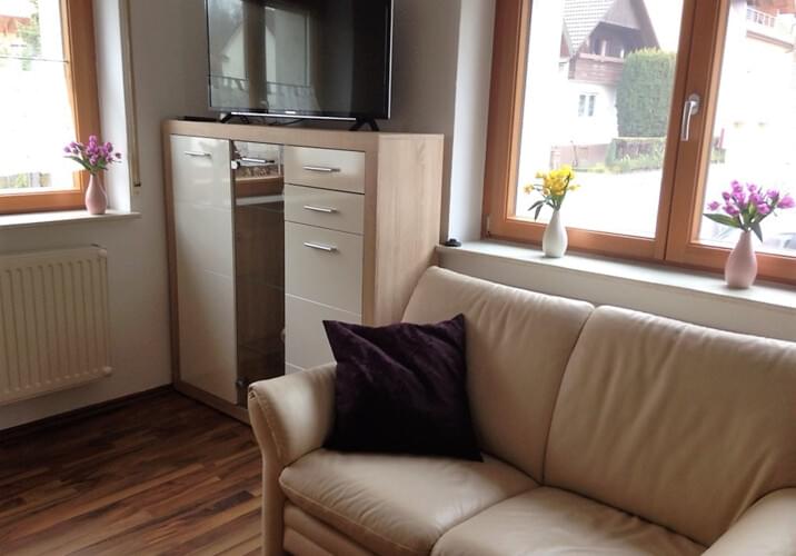 Die Zimmer sind in verschiedenen Größen und Ausstattungen buchbar. Die größeren Zimmer verfügen neben dem Bett zusätzlich noch über ein Sofa bzw. sind als Doppelzimmer mit Verbindungstür buchbar. Das größte der Zimmer lädt Sie ein, es sich auf dem Echtledersofa gemütlich zu machen. Weiter verfügt es über einen großen Flachbildschirm mit Smart-TV, so dass auch jederzeit für beste Unterhaltung gesorgt ist. In der Ecke steht ein Schwedenofen, der gerade an kalten Wintertagen für behagliche Wärme sorgt.