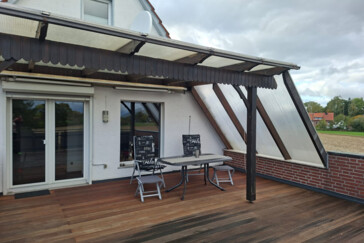 Vom Wohnzimmer mit Sat-TV, W-LAN und angrenzendem Esszimmer hat man einen schönen Blick auf die 40 qm große teil überdachte Dachterrasse.