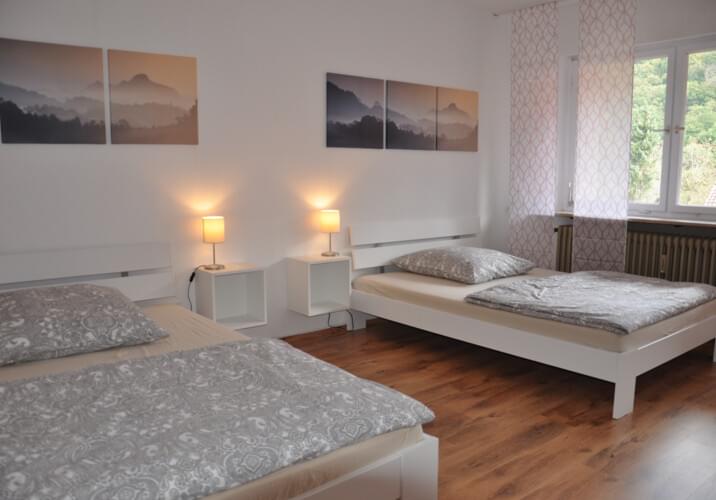 Die neu renovierten, großzügigen und schönen Zimmer (2EZ/2DZ) mit Queensize (140x200) Betten sind zusätzlich ausgestattet mit TV und WLAN, sowie eigenem Kühlschrank, der sich in der Küche befindet.
