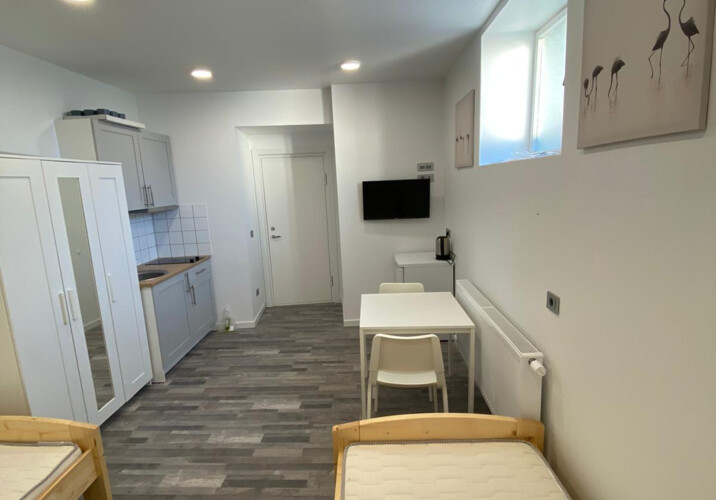 Hier bieten wir Ihnen fünf helle, komfortable und voll eingerichtete Zimmer. Die Zimmer sind mit jeweils zwei Betten, eigener Dusche, eigenem WC, eigener Küche und eigenem TV ausgestattet. Im gesamten Haus nutzen Sie kostenfreies WLAN. Die Waschmaschine steht zur freien Verfügung und kann kostenlos genutzt werden. Ihre Wäsche können Sie im Hof trocknen. Das komplette Haus wurde vollständig renoviert und modernisiert. In jedem Raum kann die Heizungstemperatur individuell reguliert werden. Vor dem Haus finden Sie kostenlose Parkplätze.