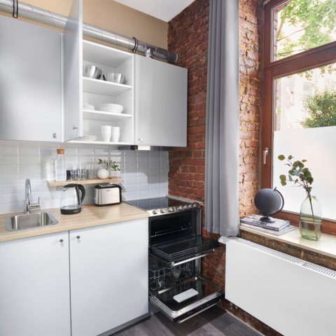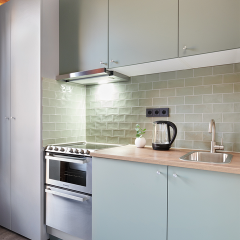 Kühl-/Gefrierschrank, Herdplatte, Backofen, Wasserkocher, Kaffeemaschine, Geschirr & Besteck