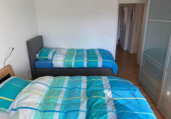 - Schlafzimmer sind ausgestattet mit Großem Bett, Nachttisch mit Nachttischlampe, Smart TV mit Netflix und Kleiderschrank