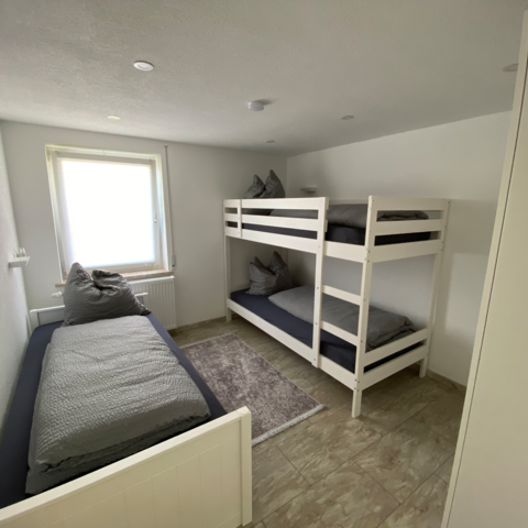 Im zweiten Schlafzimmer befindet sich ein Etagenbetten,ein Einzelbett und ein Kleiderschrank.