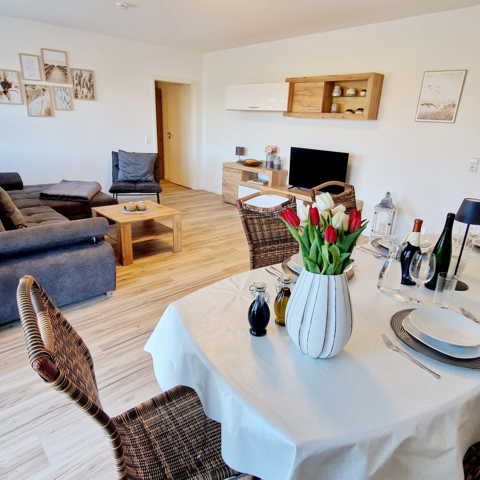 Apartment bis 6 Personen mit großzügigem Wohnbereich mit voll ausgestatteter Wohnküche inkl. Cerankochfeld, Backofen, Geschirrspülmaschine, Kühlschrank mit Gefrierfach und Mikrowelle.
