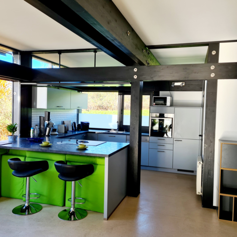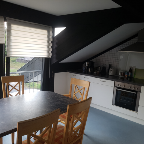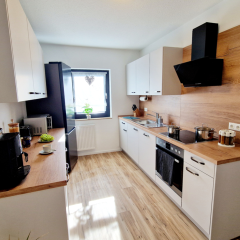 Apartment bis 5 Personen mit großzügigem Wohnbereich mit voll ausgestatteter Wohnküche inkl. Cerankochfeld, Backofen, Geschirrspülmaschine, Kühlschrank mit Gefrierfach und Mikrowelle.