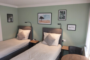 Jedes Zimmer verfügt über hochwertige Boxspring-Einzelbetten sowie Tisch, Stühle, Spiegelschrank und Garderobe.