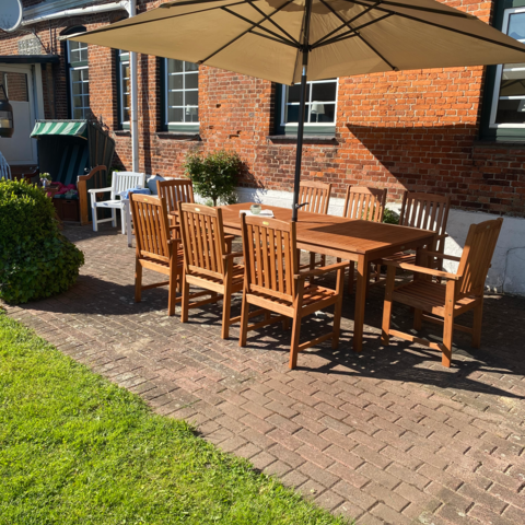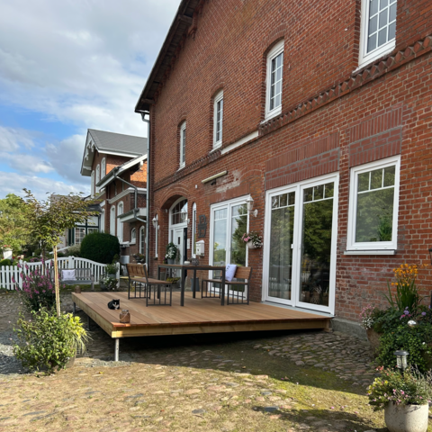 Im Jahr 2024 haben wir für unsere Gäste eine Blockbohlenterrasse im Außenbereich gebaut,