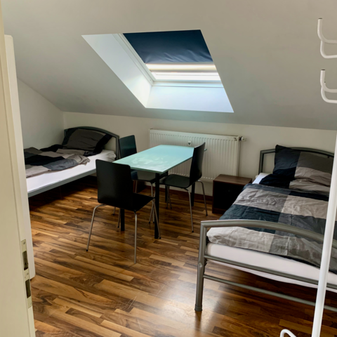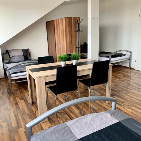 Zimmer je nach Anzahl der gewünschten Belegung verfügen über 9 Betten, Schränke, Tisch, Stühle, Garderobenständer/Haken