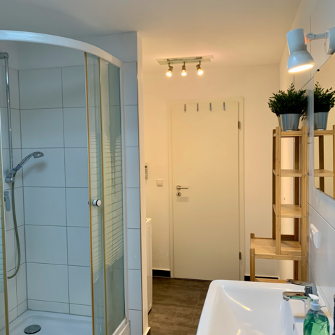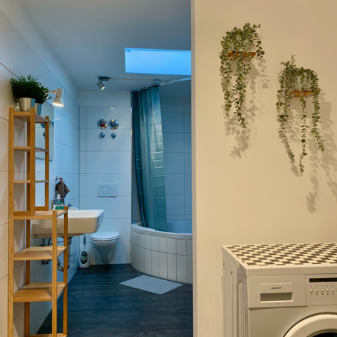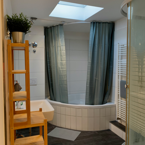 Das Badezimmer ist mit Tageslicht ausgestattet und verfügt über 2 Duschmöglichkeiten: große Eck-Badewanne mit Duschvorhang und extra Eckdusche, WC, Waschbecken, Handtuch-Heizkörper u. Waschmaschine