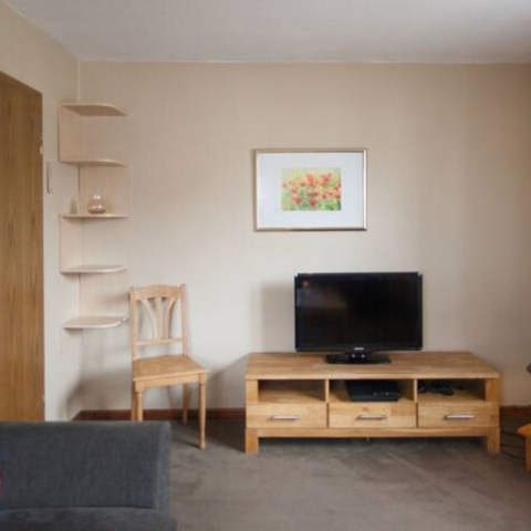 Fewo 2 (2-3 Pers.) mit 2 Einzelbetten im Schlafzimmer, weiteres Einzelbett vorhanden. Komfortable Küche mit Tisch & 3 Stühlen. Wohnbereich mit Couch, Stauraum & TV. Bad mit WC & Dusche.