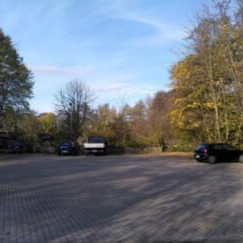 Eine große Parkfläche bietet Platz für Kraftfahrzeuge aller Art sowie Anhänger und Baumaschinen.
