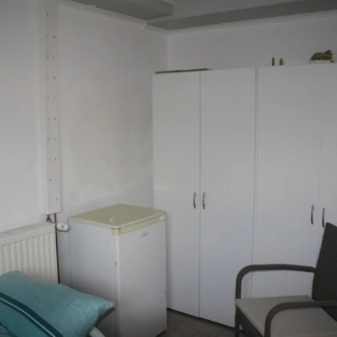 Einzelbetten, Kleiderschrank, Nachtlicht, Wäscheständer, bezogene Betten, Wolldecke, Heizkörper, Kühlschrank