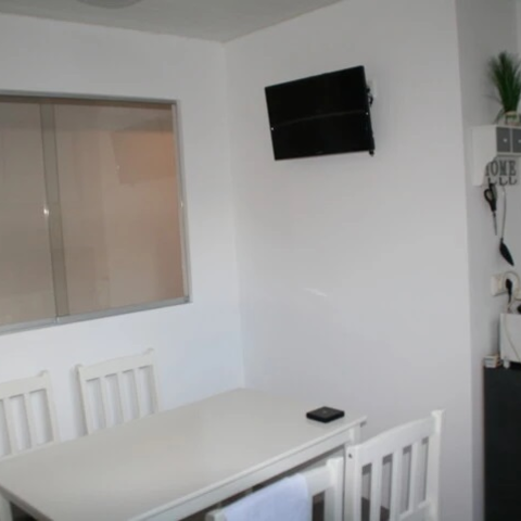 Spüle, Kochfeld, Tisch und Stühle, kleiner Backofen, Toaster, Wasserkocher, Kaffeemaschine, Smart TV, Tassen, Gläser, Teller, Besteck, Getränkekühlschrank mit Getränke, Heizkörper