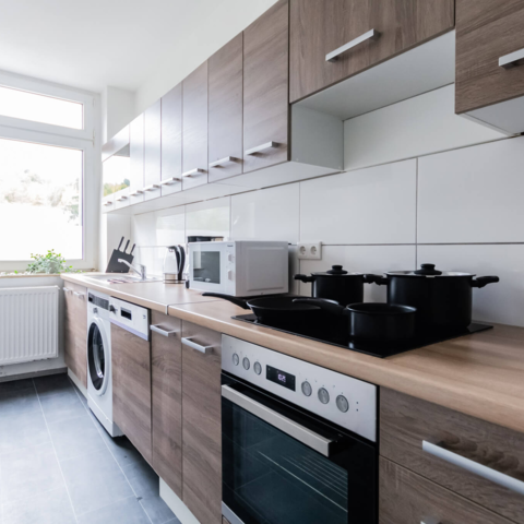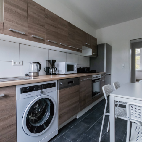 Küche: Kühl-Gefrierkombinationen, Spülmaschine, Backofen, Mikrowelle, Kaffeemaschine, Toaster, Wasserkocher, Töpfe, Pfannen, Geschirr, Gläser, Tassen, Besteck, diverse Kochutensilien, Gewürze, Kaffee, Kaffeefilter, Öl, Zucker und Süßstoff
