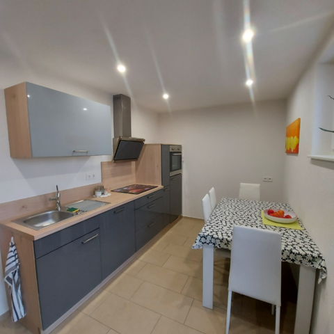Die komplett eingerichtete Küche (Fußbodenheizung) mit Tisch und Stühlen, Herd, Backofen, Mikrowelle, Geschirrspüler Kühlschrank mit Gefrierfach, Wasserkocher, Kaffeemaschine (Tassimo und Kaffeemaschine mit Filter), Eierkocher, Handrührgerät sowie Koch- Back- und Essgeschirr.