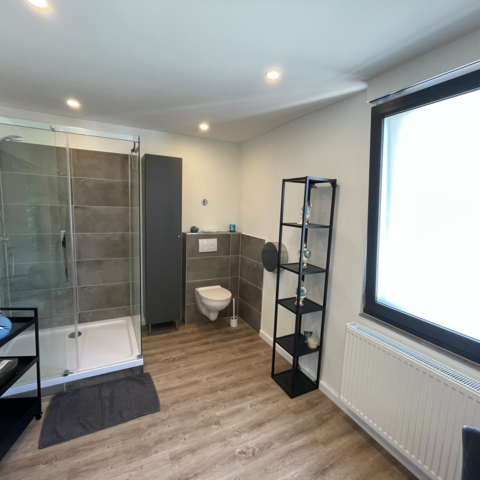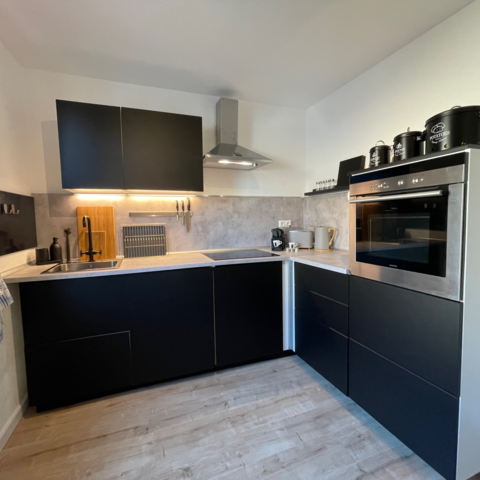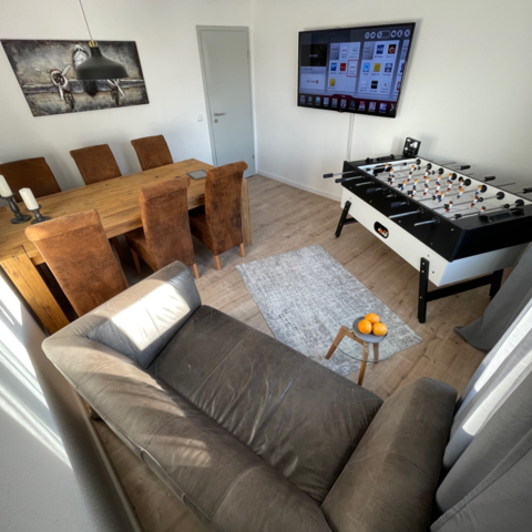 Zur Verfügung stehen 2 große Bäder, eine voll ausgestattete Küche mit Kaffeemaschine, Induktionskochfeld, Backofen/Mikrowelle/Grill und allerlei Ausstattung für alle, die Freude am Kochen haben. Das Wohnzimmer mit großem smart-TV und Tischkicker lädt zu gemeinsamen Abenden ein.