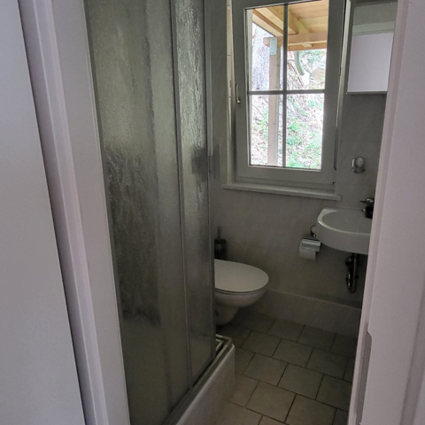Ein kleines Bad bietet Dusche, Waschbecken und WC.