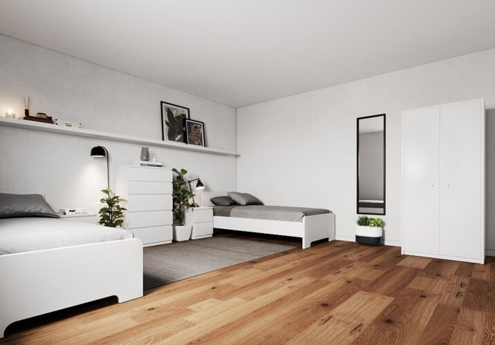 Die Wohnung in Teisnach verfügt über eine Küche, einen Gemeinschaftsraum, ein Bad mit separatem WC sowie zwei Schlafzimmern mit je zwei Einzelbetten.