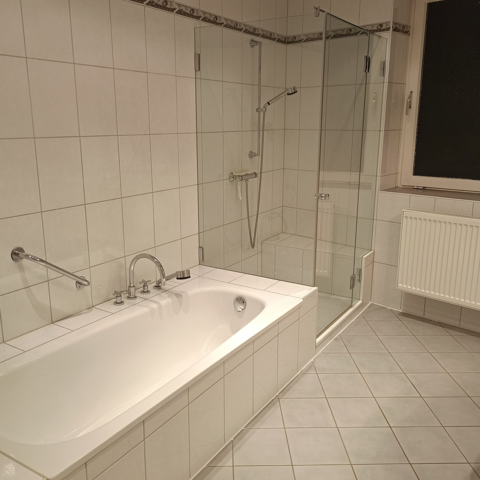 Das Badezimmer ist mit einer Dusche und einer Badewanne ausgestattet. Ein Föhn ist vorhanden. Neben dem Badezimmer befindet sich das WC.
