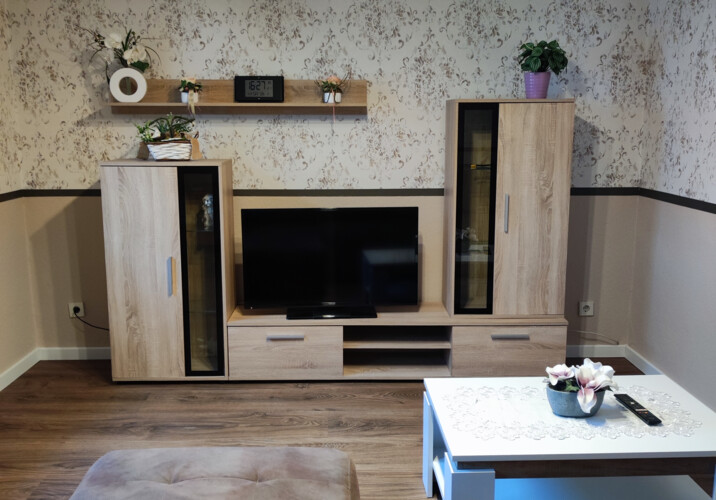 Die Wohnung ist eine ruhige Straße . Unten befinden sich Wohnzimmer , Küche und Badezimmer. In Wohnzimmer sind Schlafcouch und Fernseher vorhanden . Die Küche ist ,außer Gefrierschrank, komplett ausgestattet .Die Schlafzimmer sind auf der erste Etage.Alle 3 Schlafzimmer sind mit Einzel Betten ausgestattet .Es gibt Schlafmöglichkeit für 5 Personen . Parkplatz und WLAN sind vorhanden.