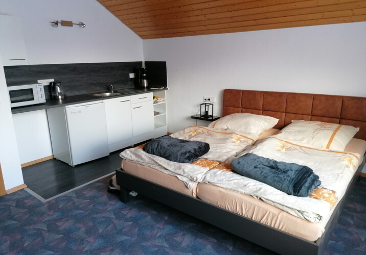 Im Zimmer finden sie Kühlschrank, Wasserkocher, Mikrowelle, 2-Platten-Herd, Spüle sowie Smart-TV (43") und freies WLAN.