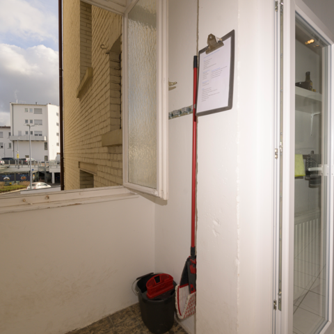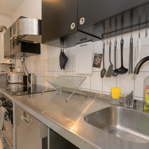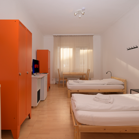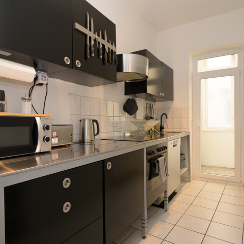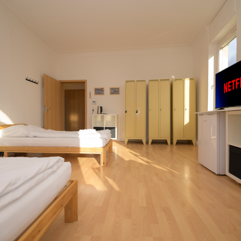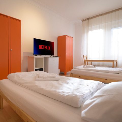 Es gibt eine voll ausgestattete Gemeinschafts-Küche mit Spülmaschine, einen Balkon und hochwertige Matratzen - für einen erholsamen Schlaf.