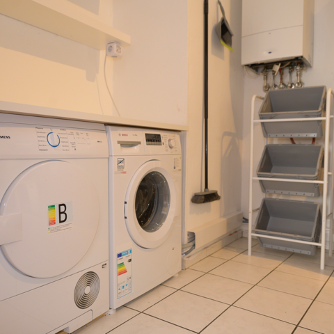 Die Küche hat eine Waschmaschine und einen Trockner.